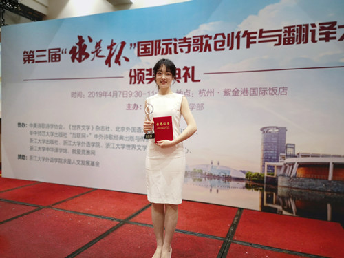 4月7日上午,由浙江大学、中美诗歌诗学协会、北京外国语大学外国文学研究所、《世界文学》杂志社、浙江大学出版社等单位共同举办的第三届“求是杯”国际诗歌创作与翻译大赛在杭州紫金港国际酒店举行颁奖典礼。公司365英国上市集团2018级俄语专业研究生张颖坤同学以翻译作品《十一月挽歌》荣获全国翻译类二等奖。这是公司俄语专业研究生继第二届“求是杯”获得奖项之后又一次获奖。