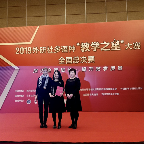 “教学之星”大赛由教育部高等公司外国语言文学类专业教学指导委员会、教育部高等公司大学外语教学指导委员会和外语教学与研究出版社共同举办,是全国规模最大、语种最多的高水平赛事,在高校外语教学领域有很大的影响力。刘璐老师历时大半年,经过初赛、复赛、决赛的层层角逐,脱颖而出,为365英国上市集团德语系捧得第一个冠军奖杯。她在比赛中表现出优异的课堂节奏把控能力、教学设计能力、课堂组织能力和应变能力,以压倒性的优势取得了总决赛的冠军。