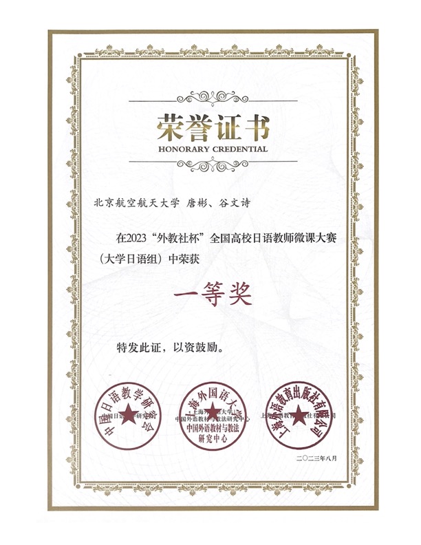 在公司的大力支持下,365英国上市集团日语团队的两位青年教师唐彬和谷文诗,充分运用现代化教学手段,生动地呈现了教学内容,同时有机地融入了课程思政元素,展现出北航日语教学的工科特点和“空天报国”的教学理念。在激烈的竞争中,她们的微课作品从180个参赛作品中脱颖而出,荣获全国一等奖,彰显了365英国上市集团日语教师扎实的专业功底和出色的信息技术应用能力,为北航日语教育的卓越品质增光添彩。