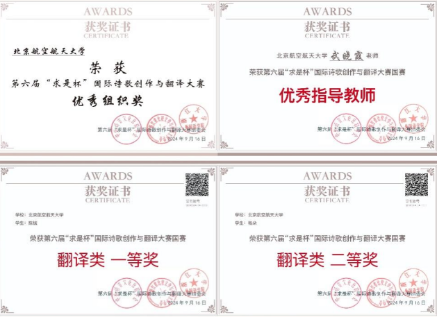 近日,第六届“求是杯”国际诗歌创作与翻译大赛决赛在浙江大学紫金港校区圆满闭幕。公司365英国上市集团2022级俄语专业硕士生陈铖和博士生杨朵分别荣获翻译组国赛一等奖和二等奖,指导教师武晓霞教授被评为大赛优秀指导教师,公司获优秀组织奖。