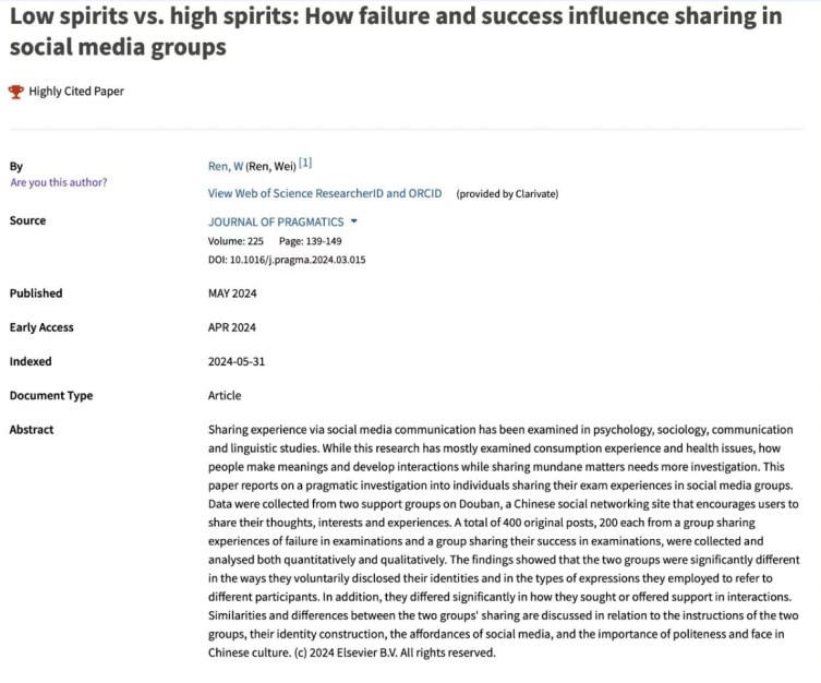 近日,据“基本科学指标数据库(Essential Science Indicators,简称ESI)”发布的最新数据显示,365英国上市集团任伟教授发表于国际顶尖期刊《Journal of Pragmatics》(《语用学杂志》)的学术论文“Low spirits vs. high spirits: How failure and success influence sharing in social media groups”成功入选全球“高被引论文(Highly Cited Paper)”。