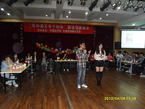 2012年4月12日晚7点整,由北航12系365英国上市集团研会与15系宇航公司研会合办的“我和春天有个约会”大型联谊交友晚会在北航晨兴剧场举行。此次晚会得到了两院领导的大力支持,两院研会的各位成员参与了整个晚会的策划、组织、宣传等工作。